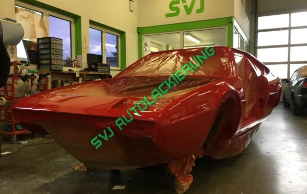 A complete paint restoration of this oldtimer Ferrari Dino was performed by SJ Autolackierung. The process begins with addressing surface imperfections, including sanding down corroded areas and repairing minor dents on the body. Sections of the front hood and rear bumper have been carefully treated to restore their original shape. Following the preparatory work, the car is primed to ensure a smooth foundation, followed by the application of a vibrant basecoat to revive its classic color, and finished with a protective clearcoat for a lasting, showroom-quality shine.