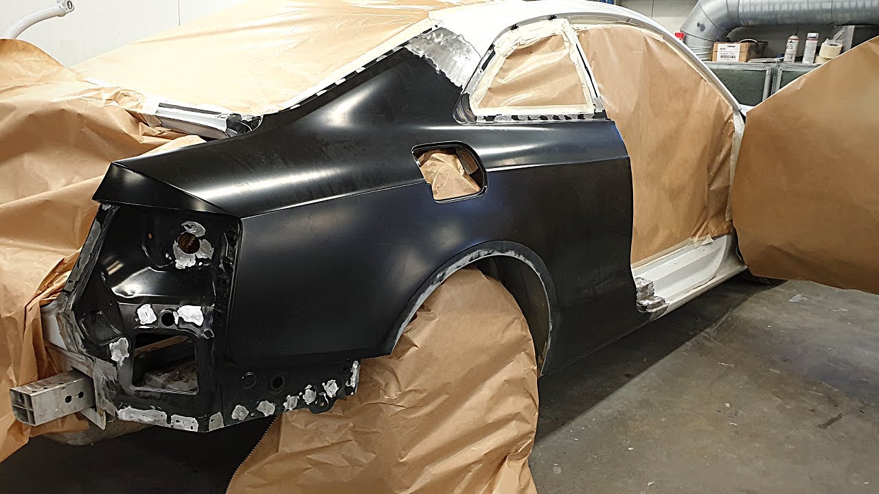 This Audi is currently undergoing side panel repairs. The rear door needs to be repaired with a new part. Parts of the rear right fender also had to be replaced. After the accident repair work, the car will be prepared for painting, where it will be primed, followed by the application of a basecoat, and then a clearcoat.